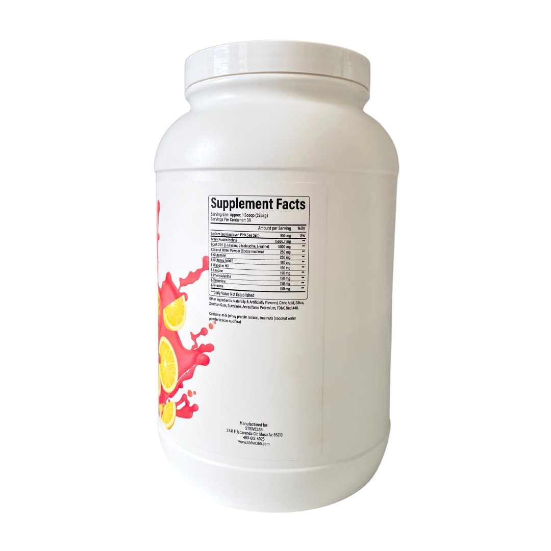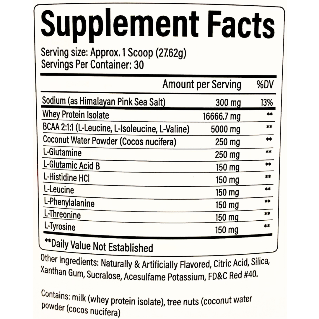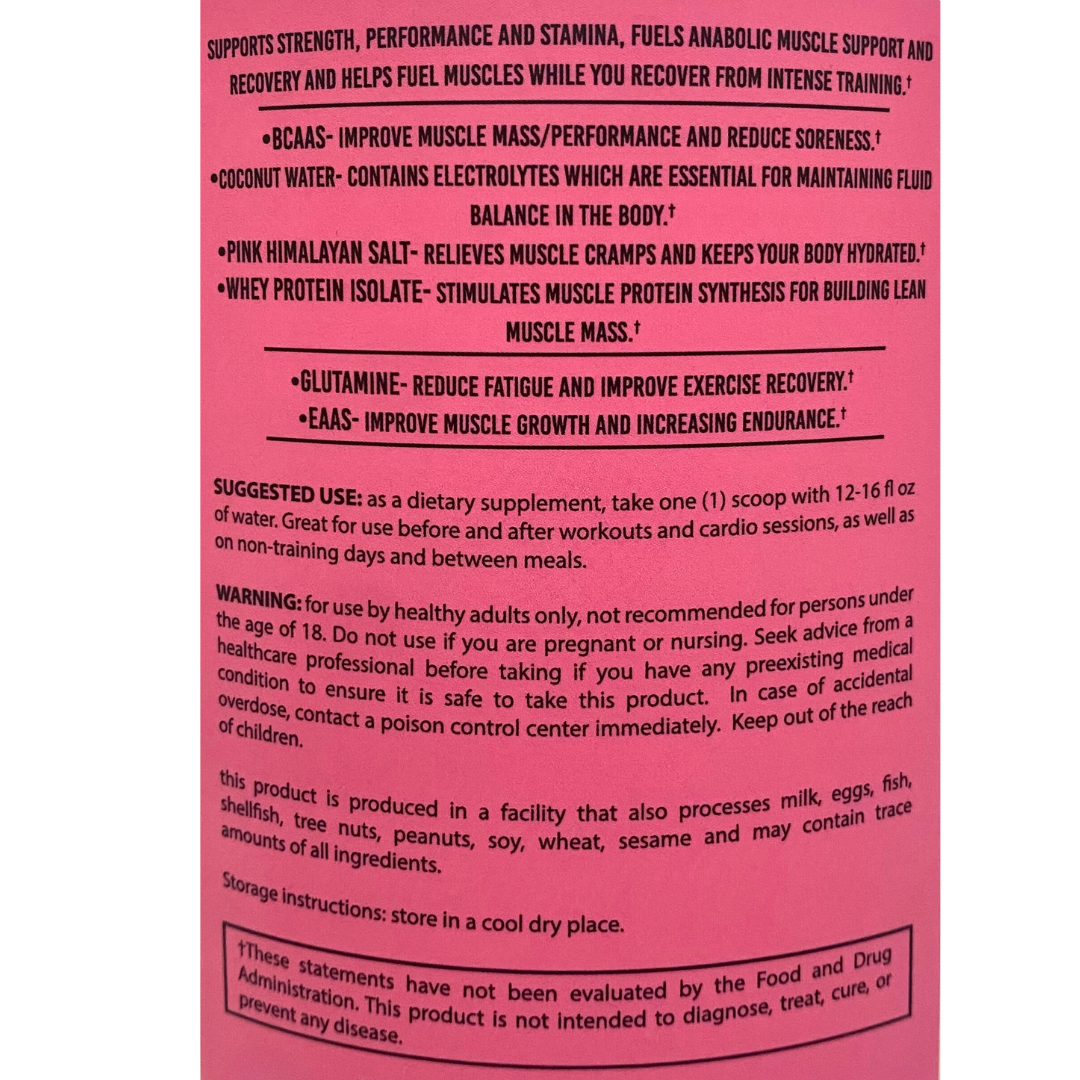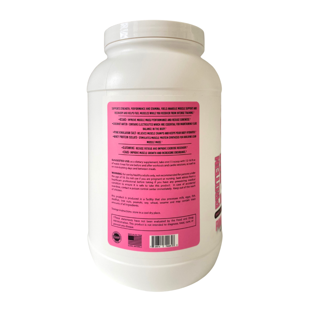 This premium protein powder contains Whey Protein and Essential Amino Acids to help build muscle strength and support muscle recovery. With added Branched Chain Amino Acids, Coconut Water, Pink Himalayan Salt and Glutamine, this powder provides your body the nourishment it needs for optimal performance.